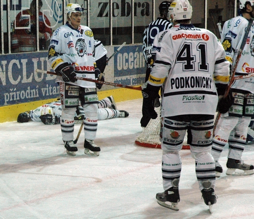 Valdemar Jiruš zůstává po nárazu Stebera ležet na ledě...